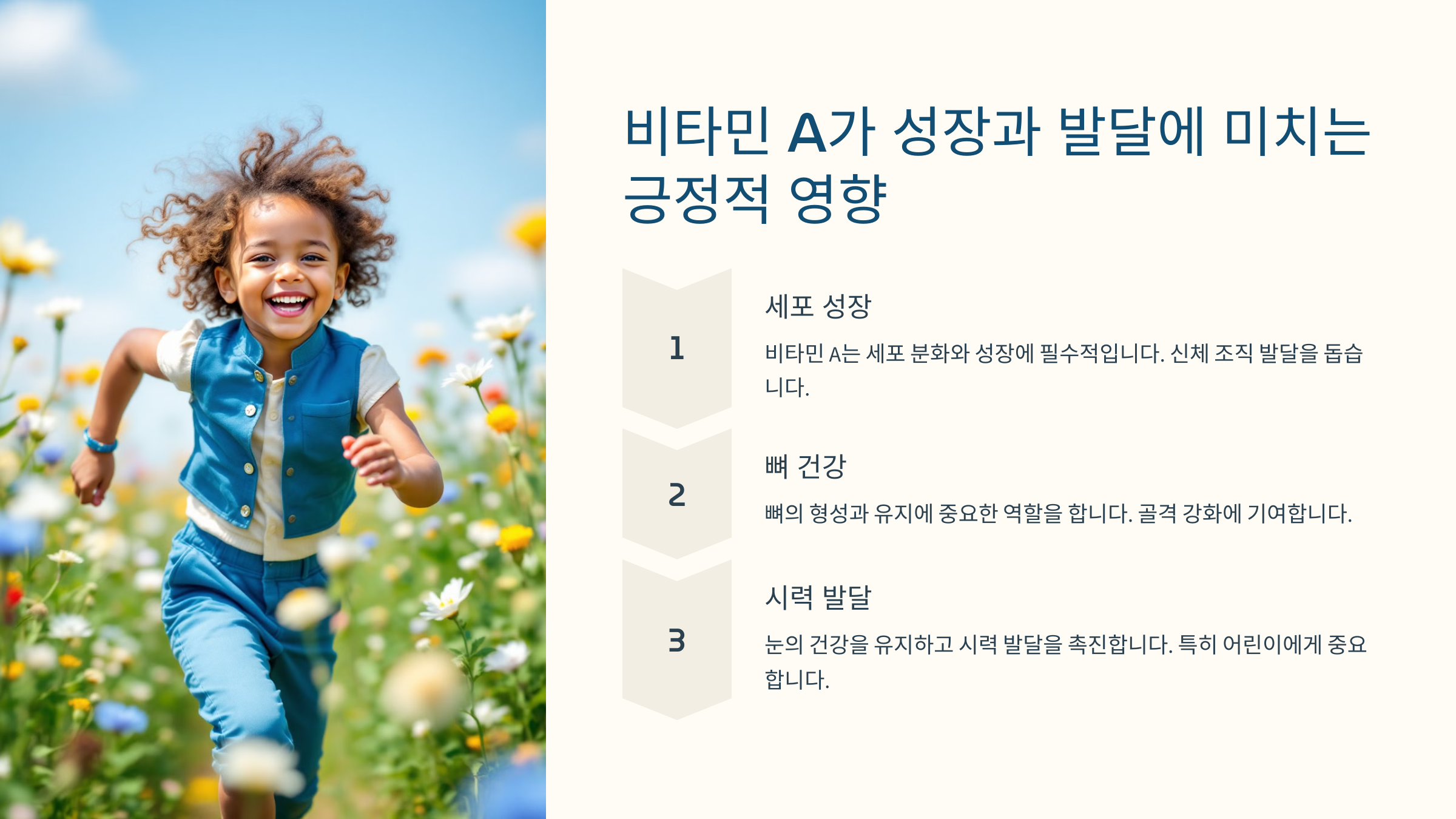 비타민A는 성장기 어린이와 청소년에게 꼭 필요한 영양소예요. 뼈 성장과 세포 발달을 돕고, 면역력을 강화해 건강한 성장을 촉진해요.